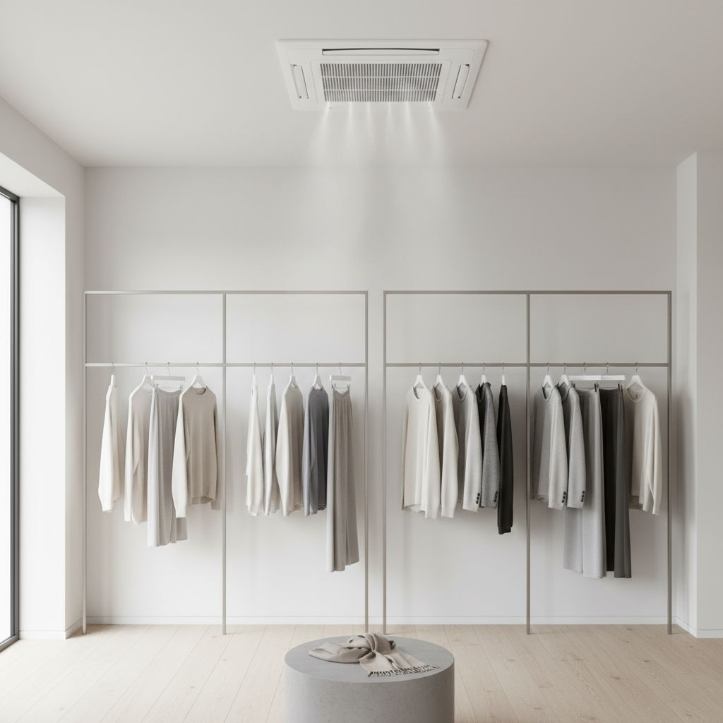 - La Cassette de plafond : C’est le standard des boutiques et des bureaux avec faux plafonds. Encastrée, elle diffuse l’air sur 4 directions pour une répartition homogène. Elle libère l’espace mural pour vos rayonnages ou votre décoration.