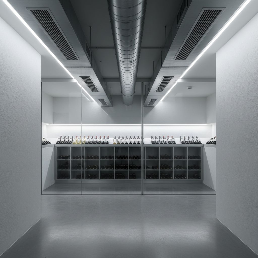 C’est le summum pour les caves de prestige, les restaurants étoilés ou les villas d’architecte. Ici, rien n’est visible dans la cave, à l’exception de discrètes grilles de diffusion. L’appareil est caché dans un faux plafond ou dans un local technique attenant. L’air est transporté via des gaines isolées.