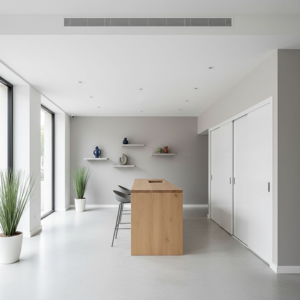 C’est la solution préférée des commerces haut de gamme ou des restaurants souhaitant une discrétion totale. L’unité est cachée dans un faux-plafond et l’air est diffusé par des grilles presque invisibles.